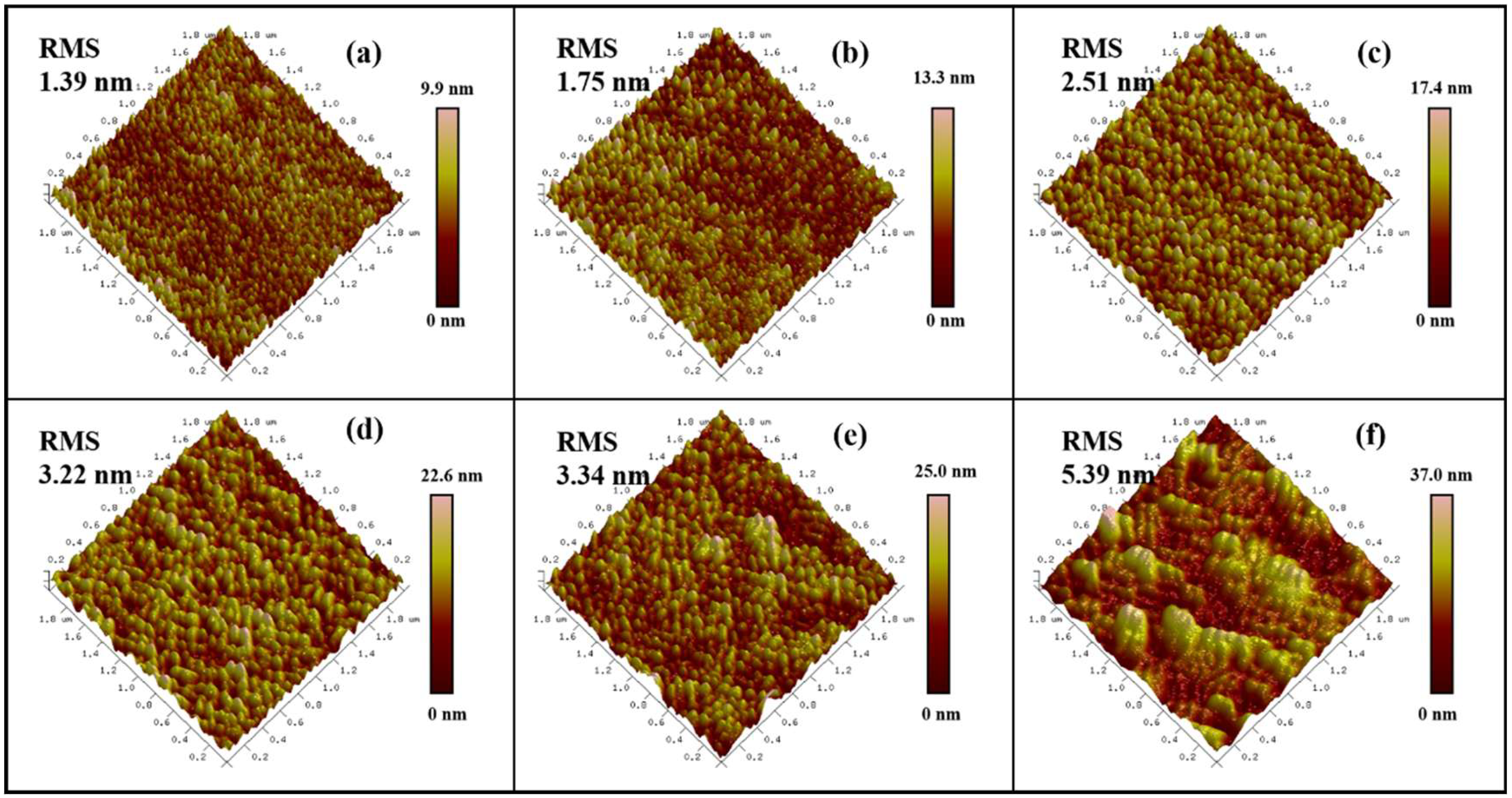 Figure 7a–f. In the observation area of 2 μm × 2 μm, it can be seen that the film as a whole was quite flat and compact. However, the root mean square (RMS) surface roughness of the films gradually increased with an increase in the RF power. The thickness of the Ag film was therefore closely related to the surface roughness of the prepared nanoparticles. Moreover, at increased RF powers, the high-energy particles bombarded the film surface, which led to an increase in the surface roughness. From