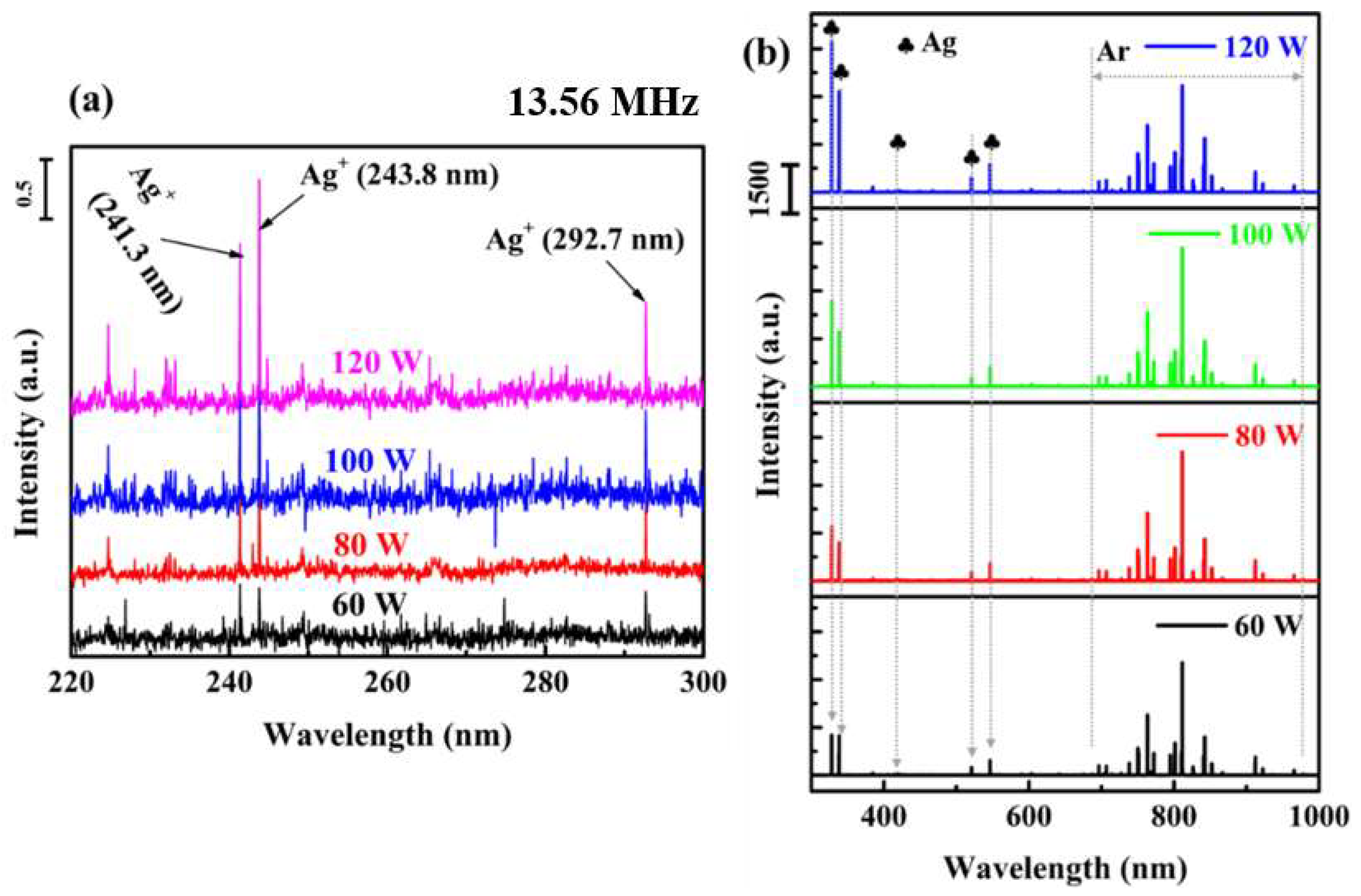 Figure 8. The working pressure was 5 Pa. The OES results revealed optical peaks of atoms and ions of Ag and Ar. All emission spectra exhibited two strong Ag resonance emission lines at 328.1 nm and 338.3 nm, corresponding to excitation energies (Eex) of 3.78 eV and 3.66 eV, respectively. The OES shows that the intensity of the main emission lines of Ag atoms at 328.1 nm and 338.3 nm increases with RF power, indicating a higher density of excited Ag atoms at elevated power levels. There were weak Ag emission lines at 421.1 nm, 520.9 nm, 546.6 nm, and 547.2 nm, which corresponded to different transitions from the energy band between Eex = 6.04–6.72 eV to the energy band between Eex = 3.66–3.78 eV. These were used to determine the ionization potential of Ag to be 7.574 eV. The Ag