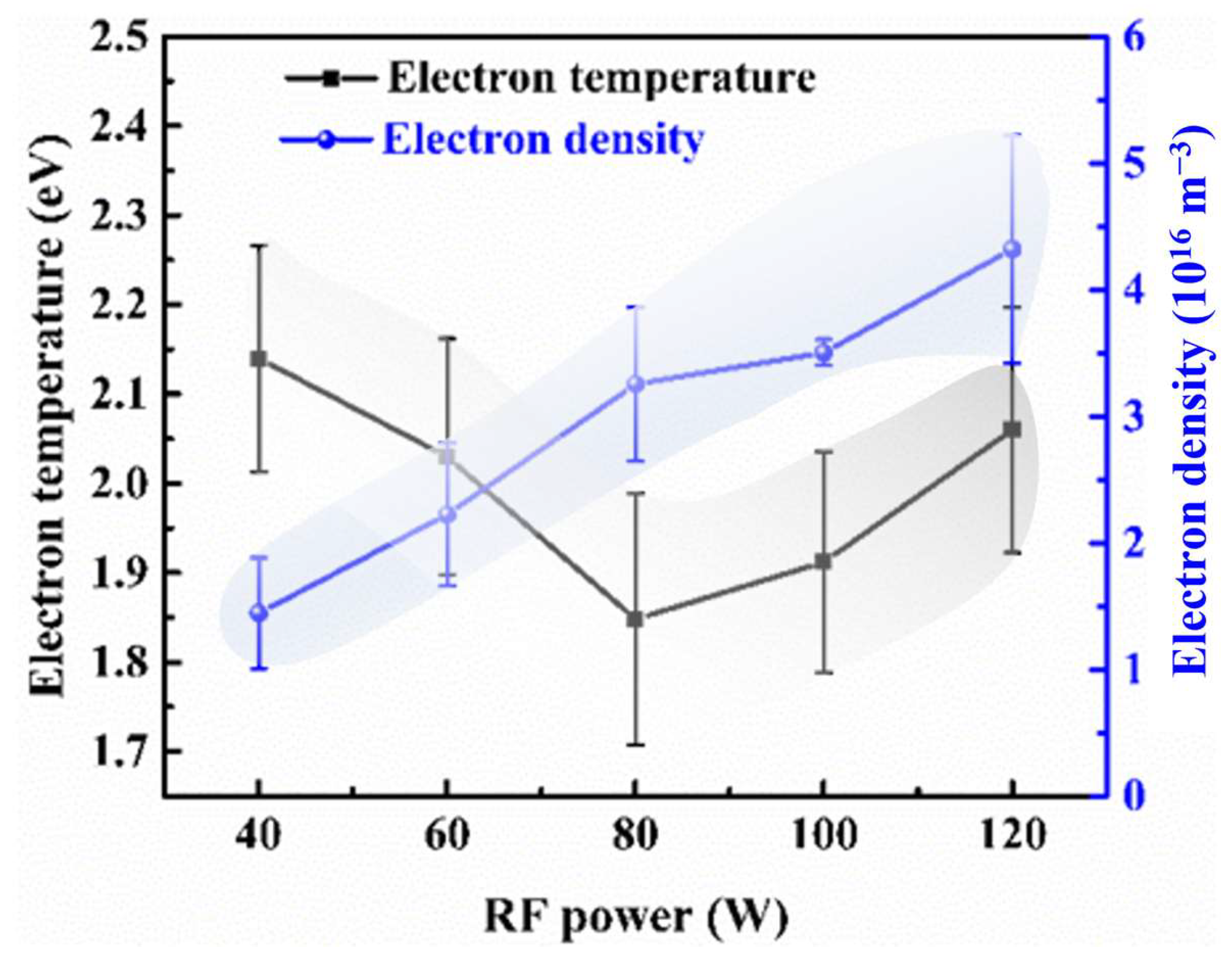 The formed RF-PMS plasma was tested using a Langmuir probe device. The variation in the values of Te and ne as a function of the RF power was measured using the Langmuir probe at a discharge pressure of about 5.0 Pa and at an Ar flow rate of 50 sccm. The results of this test are presented in