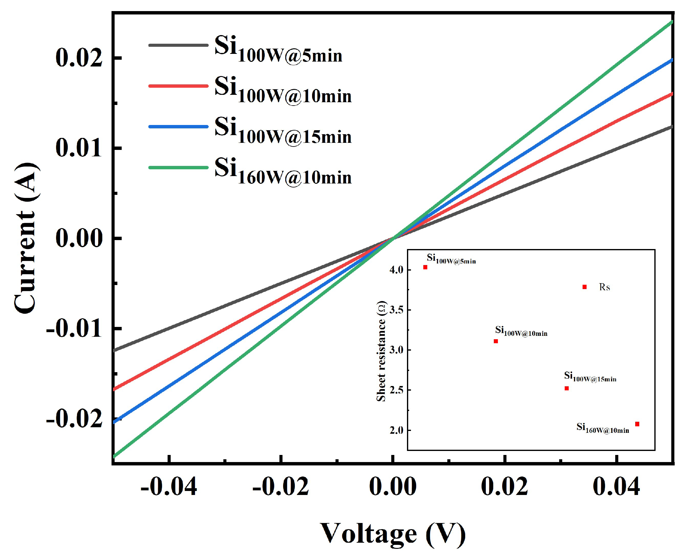 With variations in sputtering power and time, the electrical conductivity of the films changes significantly. When the deposition time is fixed at 10 min, increasing the sputtering power from 100 W to 160 W results in a noticeable increase in the slope of the I–V curve, indicating a decrease in film resistance from 3.1 Ω to 2 Ω. This is attributed to the higher atomic flux density and faster deposition rate at higher power, which leads to denser films and larger grain sizes, thereby reducing electron scattering and enhancing electron mobility.