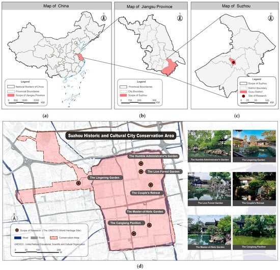 Research area: Suzhou Historic and Cultural City Conservation Area in Suzhou. (a) Location of Jiangsu Province; (b) location of Suzhou; (c) site of research; (d) research scope of the Suzhou Historic and Cultural City Conservation Area.