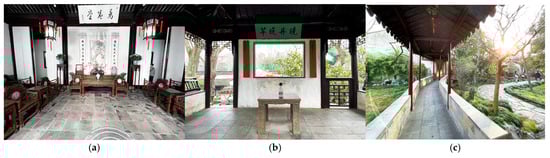 Reduction-fired cyan square bricks are commonly used in traditional gardens. (a) The Hall of Ten Thousand Volumes in Suzhou’s Master of the Nets Garden; (b) inside the Humble Administrator’s Garden Pavilion; (c) Inside the long corridor in the Lingering Garden.