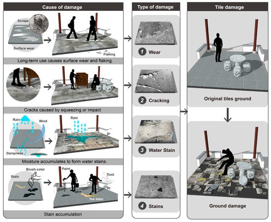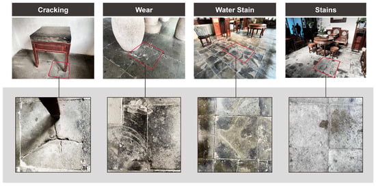 Based on on-site inspections of multiple gardens, the research team found that the surface damage of reduction-fired cyan square bricks in Suzhou’s world heritage ancient buildings was quite significant, and restoration work was time-sensitive. The damage to reduction-fired cyan square bricks can be mainly attributed to two factors, climate factors and human factors, which also make protection work more challenging [28,29]. This includes the following: (1) In terms of climate, its impact is closely related to the material properties of the tiles themselves. The Jiangnan region is humid and rainy, and reduction-fired cyan square bricks are exposed to high humidity for a long time. Traditional reduction-fired cyan square bricks have high porosity, and rainwater can easily penetrate deep into the brick body through capillary action. Long-term retention of moisture will cause irregular dark patches on the brick surface; at the same time, the humid environment will promote the growth of mold and accelerate the peeling of the brick surface. (2) In terms of human use, the damage to reduction-fired cyan square bricks is mostly caused by improper behavior during daily use. Surface contamination such as tea stains, oil stains, and paint, as well as cracking caused by heavy pressure, can directly damage reduction-fired cyan square bricks. We can identify four common types of damage based on the two main causes mentioned above: wear, cracking, water stains, and stains (Figure 5).
