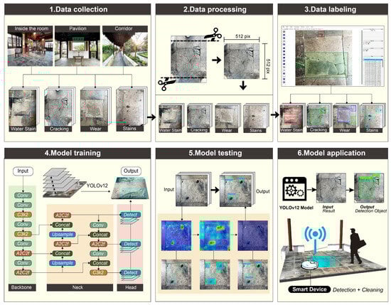 This study focused on the surface damage of reduction-fired cyan square bricks in Jiangnan classical gardens. Using YOLOv12 object detection technology, we automatically identified and classified damaged images and proposed an efficient and accurate solution for analyzing ground damage. This research process consisted of six steps, as shown in Figure 7.