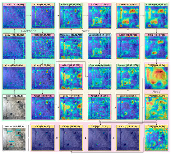 (2) The neck combines Upsample, Concat, A2C2f, and C3k2 to construct a multi-scale representation that is more friendly to small targets and fine textures. As the model reflows from the high semantic layer, it injects edge and texture details from the shallow layer into the fusion pipeline. The sequence from Upsample and Concat to A2C2f significantly improves the distinguishability of fine cracks, multi-morphological water stain edges, and scattered oil stains.