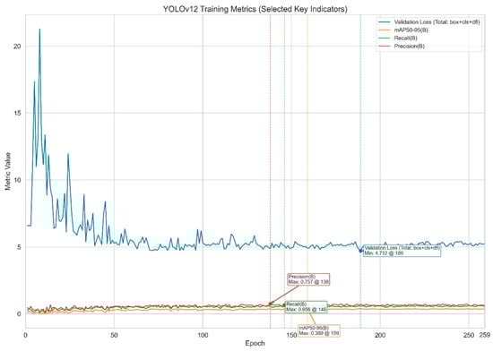 As shown in Figure 9, the curve trend shows that the validation loss (including bounding box regression, classification, and distribution regression) gradually stabilizes in the second half of training and reaches a minimum value of 4.712 at the 189th epoch, indicating that the model has achieved optimal performance in terms of overall error control. Furthermore, detection performance metrics remained relatively stable after reaching peaks in the middle phase: precision reached a peak of 0.757 at the 138th epoch; recall reached 0.656 at the 146th epoch, and average precision (mAP50–95) reached 0.389 at the 159th epoch. Overall, the model achieved relatively stable performance in the middle and late stages, maintaining a reasonable balance.
