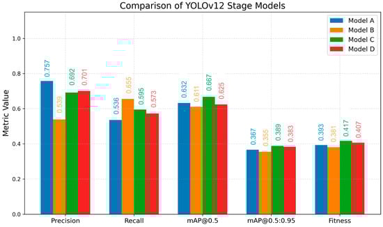 In terms of overall model performance, the metrics used include precision, recall, mean average precision (mAP@0.5 and mAP@0.5:0.95), and a comprehensive fitness metric (Fitness). As shown in Figure 10, the four models demonstrate their respective strengths and weaknesses. Model A achieves the highest precision (precision = 0.757), demonstrating its effective ability to suppress false detections. Model B excels in recall (recall = 0.655), demonstrating its broader coverage of potential impairments. Model C achieves the best performance in both mAP@0.5 (0.667) and mAP@0.5:0.95 (0.389), demonstrating its stability in both object localization and multi-threshold detection tasks. Model D, while not achieving the highest performance in any individual metric, maintains relatively balanced performance across all metrics.