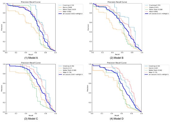 To further evaluate the effectiveness of different models for detecting specific damage types, this study plotted precision–recall curves for four candidate models and calculated the mean average precision (mAP) at 0.5 for each category. Compared to overall metrics, the precision–recall curve more intuitively reflects the changing trends in a model’s precision and recall at different confidence thresholds, revealing the detection difficulty and adaptability of each category.