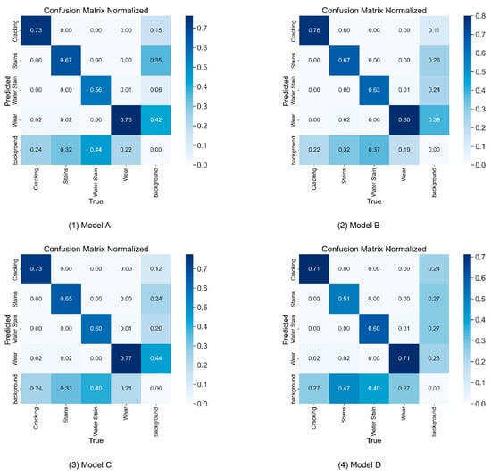 Furthermore, the confusion matrix reflects the proportion of each type of damage that is correctly identified or misclassified as another category during the prediction process, revealing the strengths and weaknesses of the model in multi-class detection tasks. As shown in Figure 12, the diagonal values indicate that cracks and wear are generally well identified, while stains and water stains still exhibit significant confusion. For example, Model A achieves an accuracy of 0.73 for cracking and 0.76 for wear, but only 0.67 for stains, with 0.32% misclassified as background. Model B improves its performance for cracking to 0.78. Model C demonstrates the most balanced overall performance across multiple categories, achieving 0.73 and 0.77 for cracking and wear, respectively, and maintaining 0.60 and 0.65 for water stain and stains. In contrast, Model D achieves the lowest accuracy for stains, at only 0.51, and the highest misclassification rate for background (0.47), demonstrating its limited robustness against complex background interference. A further comparison reveals that background classification is a key factor influencing overall performance. Consistent with the PR curve results in the previous section, stains and water stain remain the most challenging categories; while cracking and wear maintain high consistency and stability across all models.