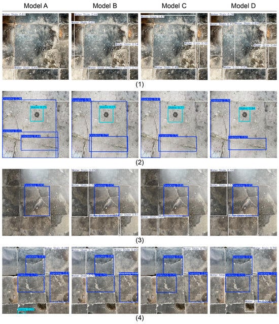 From the overall performance perspective, all four models can accurately identify target damage in the training set, but there are differences in performance in different categories and scenarios. In the sample of Figure 13(1), all four models can detect multiple water stains, but the number and position of the prediction boxes of Models A and C are more consistent with the actual damage area, with confidence levels in the range of 0.44–0.81, while Models B and D have some box overlaps or low confidence levels. Figure 13(2) shows a combined scene of cracks and stains. All four models correctly identify the main cracks, and the confidence levels are all above 0.70. However, in the detection of stains, the predictions of Models C and D are more stable (confidence levels 0.77 and 0.84), while the detection box boundaries of Models A and B are not accurate enough. The results in Figure 13(3,4) further reflect the differences between the models: in terms of crack detection, all four models can output stable results, but in the identification of water stains and stains, the confidence levels of Models C and D are generally higher than those of Models A and B, and the number of false detections is smaller.