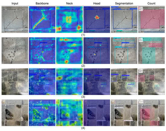 Furthermore, this study’s method not only provides typological identification of reduction-fired cyan square brick damage but also achieves quantitative output through segmentation and counting, which has direct implications for project management. Compared to traditional methods that rely on manual visual inspection, AI-based inspection can significantly improve efficiency in large-scale garden reduction-fired cyan square brick inspections and reduce subjective bias in human judgment. More importantly, heatmap visualization provides diagnostic evidence for subsequent research, aiding in understanding the model’s focusing mechanism and serving as a reference for manual inspections.