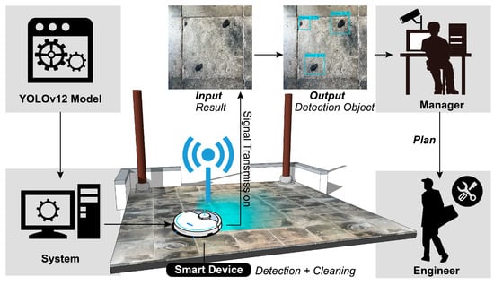 In response to the characteristics and protection needs of Jiangnan classical garden’s reduction-fired cyan square bricks, this study designed an intelligent ground detection application model. The trained algorithm model can be embedded in an intelligent ground detection terminal with cleaning capabilities [37], creating an intelligent detection device that can not only identify ground damage and but also provide cleaning capabilities (Figure 16).