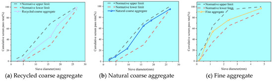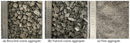 The coarse aggregates used in this study were recycled coarse aggregate (RCA) and natural coarse aggregate (NCA) with a continuous gradation of 5–26.5 mm. The RCA was sourced from construction and demolition waste (CDW) of a demolition project in Zibo City and prepared through mechanical crushing, sieving, and grading processes. The NCA was conventional crushed stone. The performance indices of the coarse aggregates complied with the technical requirements of JGJ 52-2006 [35]. It is worth noting that the continuous gradation of 5–26.5 mm for coarse aggregates was chosen to achieve a dense particle packing structure, minimizing the void content and improving the overall compactness of the concrete, which is especially critical for frost resistance.