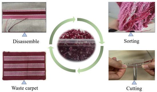 Discarded polypropylene fibre (PPF) carpets were selected as the source material for the test fibres. The fibre material for testing was prepared through manual processing. After the raw fibre material underwent disassembly and sorting, it was successively subjected to pre-treatment processes of cleaning, disinfecting, and natural air-drying. Subsequently, manual sorting and precise cutting processes were employed to control the fibre bundle length parameter (19 mm), ultimately yielding fibre material that met the test requirements. The relevant performance parameters of the waste polypropylene fibre (WPF) are listed in Table 3. The specific processing flow chart for the WPF is shown in Figure 3.