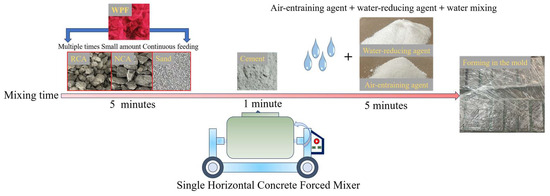 To ensure uniform distribution of fibres during mixing with concrete, the dry mixing method was adopted in this test. The specific procedure is shown in Figure 4.