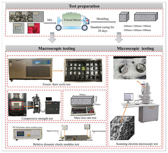 The test procedure for this study is shown in Figure 5 and mainly comprises the following three parts: specimen preparation, macroscopic testing, and microscopic testing. The specific testing methods are described below.