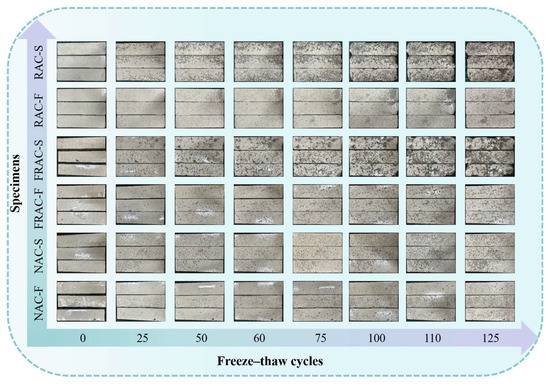 Surface morphology of each group of specimens under different freeze–thaw cycles.