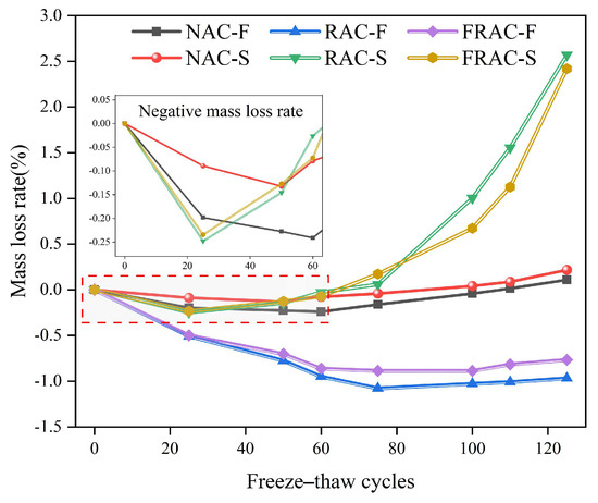 The relationship between the mass loss rate and the number of freeze–thaw cycles for each group of specimens is shown in Figure 7. As the number of freeze–thaw cycles increased, all specimen groups exhibited a trend of initial decrease (including negative values, indicating mass gain) followed by an increase in mass loss rate, which is consistent with literature reports [49,50]. The negative mass loss rate, i.e., mass gain, occurred despite pre-soaking because the specimens were not fully saturated at the start of the test. Early freeze–thaw cycles promoted the development and interconnection of microcracks, facilitating the infiltration of external solution into these newly formed micropores. This ingress of water contributed temporarily to mass gain, outweighing the limited mortar spalling at this stage. The subsequent increase in loss rate was due to the increasing number of freeze–thaw cycles exacerbating surface mortar spalling of the specimens, where the resulting mass loss surpassed the compensatory effect of solution infiltration [13]. It is worth noting that including mass gain in the analysis is relevant for frost damage assessment, as it provides insight into early micro-damage development prior to macroscopic material loss. The presence of this phase underscores the importance of considering both mass gain and loss to fully understand the deterioration mechanism of concrete under freeze–thaw conditions.