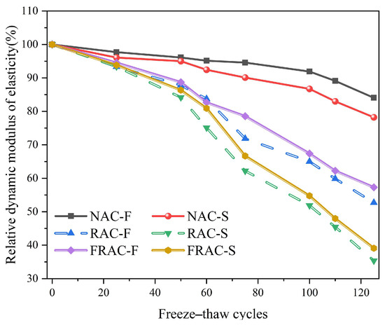 As a key indicator for evaluating the elastic properties of materials, the continuous attenuation of the RDEM directly reflects the irreversible accumulation process of freeze–thaw damage. The RDEM of specimens in all groups exhibited a continuous decreasing trend with increasing freeze–thaw cycles, as shown in Figure 8. This is primarily because freeze–thaw cycles caused coarsening of the concrete pore structure and aggravated interconnection of microcrack networks, compromising the continuity of the matrix and hindering ultrasonic wave propagation [49]. Furthermore, the attenuation amplitude of RDEM in RAC was significantly higher than that in NAC. The reason is that the inherent microcracks and weak interfaces within RCA provided preferential paths for freeze–thaw damage development, thereby accelerating performance deterioration [51]. The damaging effect of the saline freeze–thaw environment on RDEM was more severe compared to the freshwater environment. This stemmed from the high crystallization expansion pressure generated by salt solution, which far exceeded that of freshwater freeze–thaw, intensifying microcrack development and further compromising the continuity of the matrix [15].