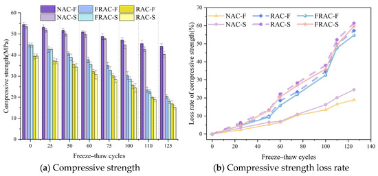 The variations in compressive strength and compressive strength loss rate with the number of freeze–thaw cycles for each specimen group are shown in Figure 9a,b. The compressive strength of all specimen groups continuously decreased with increasing freeze–thaw cycles, while the compressive strength loss rate correspondingly increased. This strength deterioration pattern is consistent with reports in existing studies [54]. The primary reason is that the repeated cyclic stress induced by frost heave pressure caused progressive propagation of microcracks and weakening of interfacial bonding between the aggregate and the mortar. This reduced the effective load-bearing area and induced stress concentration, leading to a macroscopic decline in compressive strength.
