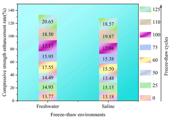 To further investigate the improvement effect of WPF on the compressive strength of RAC under different numbers of freeze–thaw cycles and in different environments, this study calculated the enhancement rate of WPF on RAC compressive strength according to Equation (5):