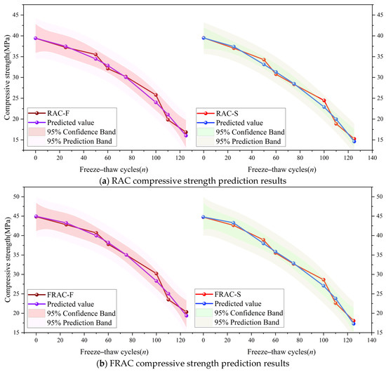 Based on the test results, a predictive model for the compressive strength of RAC in a freshwater freeze–thaw environment was developed through polynomial regression analysis. The model was fitted using experimental data obtained from eight different freeze–thaw cycles (n = 0, 25, 50, 60, 75, 100, 110, and 125), with three parallel specimens for each data point, thus constituting a robust dataset for the analysis. The specific expression is shown in Equation (6):