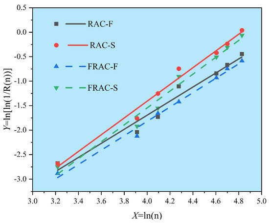 where fR,0 is the compressive strength of the RAC specimen before freeze–thaw cycles (MPa); n is the number of freeze–thaw cycles.