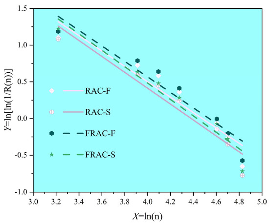 where ωs,n and ωf,n represent the compressive strengths of the specimen after n freeze–thaw cycles in salt solution and freshwater (MPa), respectively; εFRAC,n and εRAC,n represent the compressive strengths of FRAC and RAC after n freshwater freeze–thaw cycles (MPa), respectively.