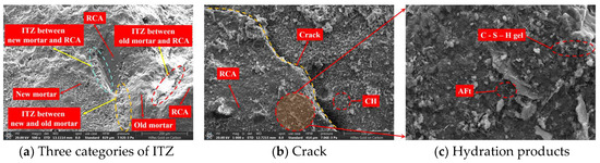 This study used a Sirion 200 SEM produced by FEI Company in Oregon, USA, to scan RAC and FRAC specimens after the freeze–thaw cycles. Sample blocks were cut from the core of the tested specimens to avoid edge effects, with a specific focus on areas containing the interface transition zone (ITZ) between aggregate and mortar. These samples were then dried, and sputter-coated with a thin layer of gold to ensure electrical conductivity. The scanning acceleration voltage ranged from 0.2 to 30 kV, and the image resolution was 1.5 nm.
