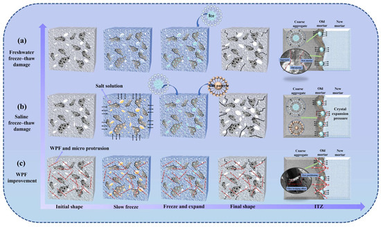 Concrete structures located in mid-to-high latitude cold regions are universally subjected to freeze–thaw damage [8]. This issue is particularly prominent in offshore and coastal engineering, where freeze–thaw damage in saline environments is characterized by more severe, deeper, and faster deterioration [9]. Consequently, frost resistance and its performance in saline environments are key indicators for evaluating the durability and service life of concrete. However, compared to natural aggregate concrete (NAC), RAC exhibits significantly degraded mechanical properties and frost resistance due to the high porosity, high water absorption, and complex multi-interface transition zone (ITZ) structure resulting from the residual old mortar adhered to the RCA surface. This degradation constrains the wider application of RAC [2]. Research has indicated that incorporating RCA reduces the frost resistance of concrete, and the degree of performance deterioration has intensified with increasing RCA replacement ratios and the accumulation of freshwater freeze–thaw cycles [10,11]. Notably, studies by Bogas et al. have presented a contrasting view, suggesting that the higher permeability of RCA could potentially improve the frost resistance of RAC [12].