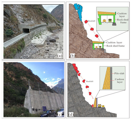 Engineering application background: (a,b) rock-shed; (c,d) pile-slab and cushion layer rockfall barrier.