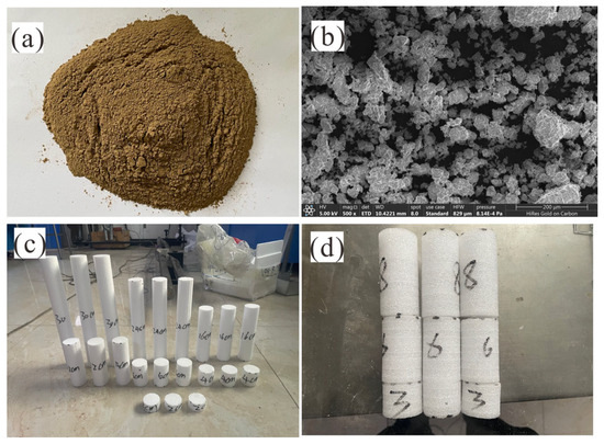 Specimen electron microscope scanning morphology: (a,b) soil; (c) EPS cushion layer; (d) EPE cushion layer.