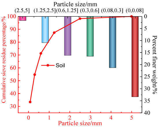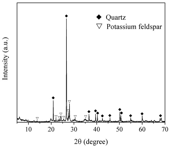 The sand used in the tests was sourced from Zibo City, Shandong Province (Figure 2a,b). According to the results of the geotechnical tests, the natural water content of the soil sample was 32.3%. As this study does not consider the impact of water content on stress wave propagation, the soil was dried at 105 °C for 48 h during preparation. Subsequently, sieve analysis was conducted using sieves with apertures of 5 mm, 2.5 mm, 1.25 mm, 0.6 mm, 0.3 mm, and 0.08 mm. Based on the particle size distribution curve (Figure 3), particles larger than 2 mm accounted for 5.0% of the total mass, while particles larger than 0.075 mm constituted 67.0% of the total mass. According to national standards [45], the soil sample was classified as sandy soil. Additionally, the median particle size (d50) of the soil was 0.58 mm, with a uniformity coefficient (Cu) of 5.00 and a curvature coefficient (Cc) of 0.91. Scanning Electron Microscopy (SEM) images of the soil sample show that the soil particles consist of irregularly shaped particles with sharp edges and high surface roughness. Numerous micro-cracks and pores are visible on the particle surfaces, with particles primarily in point or mixed point-face contact. XRD (X-ray diffraction) analysis results (Figure 4) indicate that quartz and albite are the main mineral components in the soil samples, with a relatively high intensity of quartz diffraction peaks, accompanied by multiple sets of feldspar diffraction peaks.