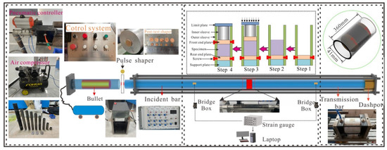 Experiments were conducted using the Split Hopkinson Pressure Bar (SHPB) system provided by the Archimedes Dynamic Testing Laboratory (Tianjin, China) with modifications made to the setup to accommodate testing of particulate materials (Figure 5). The system consists of three main modules: the power module, the pressure bar system, and the data acquisition module. The power module compresses nitrogen gas, stores it, and drives a metal projectile to impact the incident bar, generating a compressive stress wave. The projectile velocity is controlled by adjusting the nitrogen pressure, allowing for loading at different strain rates. The bar system comprises a 2.4 m long incident bar and a 2.0 m long transmission bar, both made from 7075 aluminum alloy, with an elastic modulus of 71 GPa and a stress wave propagation velocity of approximately 5000 m/s. Due to the significant wave impedance mismatch between the specimen and the bars, semiconductor strain gauges were selected for signal acquisition. The strain gauges have a nominal resistance of 120 Ω and are amplified by a factor of 1000. The strain gauges are positioned 850 mm from each end of the specimen. Data acquisition is performed at a frequency of 10 MHz, ensuring accurate capture of the entire stress wave propagation process under impact loading, thus guaranteeing data timeliness and integrity.