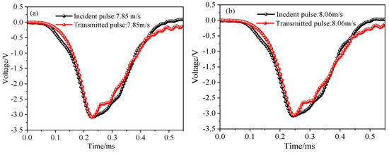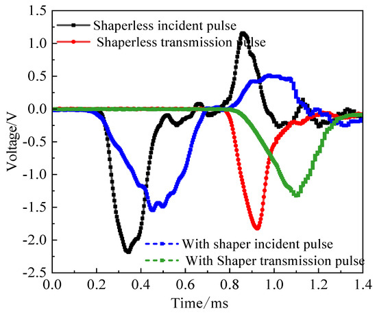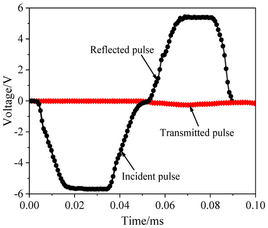Figure 6 displays the typical incident, reflected, and transmitted wave signals, all of which are smooth and continuous without noticeable jumps or oscillations. Figure 7 compares stress wave propagation before and after introducing the pulse shaper. Without it, the incident waveform is sharp and exhibits high-frequency oscillations, while the transmitted wave shows pronounced distortion—indicating a steep shock front prone to reflection and interface interference. With the pulse shaper, the incident waveform is smoother, its rising edge broader, and oscillations greatly reduced; the transmitted signal becomes more stable, and its main peak is delayed. These improvements signify that the pulse shaper prolongs the loading duration and optimizes the stress wave delivery process. Overall, compared to tests without a pulse shaper, the application of the pulse shaper increased the pulse duration by 60%, greatly enhancing the reliability of the experiment. Figure 8 compares no-load conditions before and after adding the sleeve and plates. Before this modification (Figure 8a), the incident and transmitted signals overlap significantly. Afterward (Figure 8b), using matching materials for plates and bars eliminates waveform changes, confirming that the sleeve and plates have negligible impact on the signals and satisfy experimental requirements.