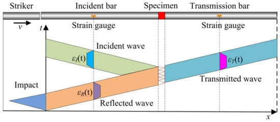 Figure 9 illustrates the propagation process of the stress wave in the specimen. At the start of the experiment, the impact bar, driven by the actuator, strikes the free end of the incident bar at a certain velocity, generating a compressive stress wave that propagates axially along the incident bar, referred to as the incident wave. This wave propagates through the incident bar at the material’s elastic wave velocity until it reaches the interface between the incident bar and the specimen. Upon reaching the interface, due to the difference in wave impedance between the two materials, a portion of the wave is reflected back into the incident bar, forming the reflected wave. The reflected wave propagates in the opposite direction along the incident bar and is recorded by the strain gauges. At the same time, another portion of the energy from the incident wave passes through the interface into the specimen and continues to propagate. When the wave passes through the specimen and reaches the interface between the specimen and the transmission bar, part of the wave is transmitted into the transmission bar, forming the transmitted wave, which is recorded by the strain gauges installed on the transmission bar.