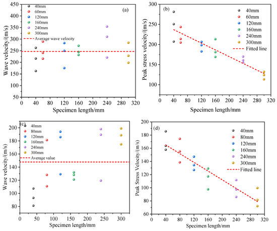 Effect of EPS layer specimen length on stress wave propagation characteristics: (a) wave velocity in EPS cushion layer; (b) peak stress velocity in EPS cushion layer; (c) wave velocity in EPE cushion layer; and (d) peak stress velocity in EPE cushion layer.