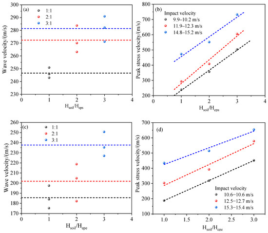 Effect of composite cushion layer on stress wave propagation characteristics: (a) wave velocity in soil–EPS cushion layer; (b) peak stress velocity in soil–EPS cushion layer; (c) wave velocity in soil–EPE cushion layer; (d) peak stress velocity in soil–EPE cushion layer.