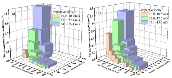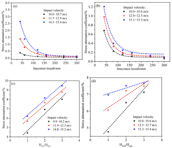 For both EPS and EPE, the stress wave attenuation coefficient decreases exponentially with increasing specimen length (Figure 12a,b). In the case of EPS, when the specimen length is less than 50 mm, the attenuation coefficient decreases rapidly, indicating that most of the stress waves are either reflected or absorbed in EPS. As the specimen length increases beyond 100 mm, the transmission coefficient stabilizes, suggesting that the dissipation of stress waves by the cushion layer gradually saturates. For the same specimen length, a higher impact velocity results in a larger proportion of transmitted stress, showing that the attenuation effect in the medium is strain rate-sensitive. Figure 12b shows the relationship between the stress wave attenuation coefficient and specimen length for EPE material. Compared to the EPS medium, the relationship between the attenuation coefficient and specimen length is approximately the same. However, for specimens shorter than 50 mm, the attenuation coefficient of EPS is significantly higher than that of EPE. Moreover, in EPS, a larger thickness is required to reduce the attenuation coefficient to a level similar to that of EPE. Overall, under the same conditions, EPE foam exhibits a generally superior attenuation capacity compared to EPS foam, particularly under short-range and high-intensity impacts, demonstrating better cushioning performance for stress wave attenuation.
