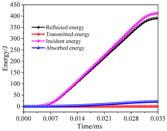 where WI, WR, WT, and WS represent the incident energy, reflected energy, transmitted energy, and absorbed energy, respectively. AC and EC are the cross-sectional area and the elastic modulus of the bar, respectively. CC is the propagation velocity of the compressive stress wave in the bar. εI and εR are the incident and reflected strains, respectively, and εT is the transmitted strain. t represents time.