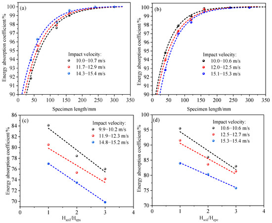 Figure 14a,b show the variation in the energy absorption coefficient with specimen length for EPS and EPE foam materials under different impact velocities. As the specimen length increases, the energy absorption coefficient increases and stabilizes once the specimen length exceeds 100 mm. This indicates that the material’s energy absorption effect rapidly diminishes within a certain propagation distance. Comparing the two materials, EPE exhibits a higher energy absorption coefficient than EPS under the same conditions, with a steeper increase in the curve, demonstrating superior energy dissipation properties.