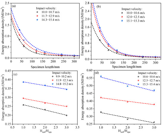 Figure 15c,d show the variation trends of energy absorption density for composite specimens under different impact velocities. The results indicate that for both soil–EPS and soil–EPE composite layers, the energy absorption density significantly decreases as the soil specimen length ratio increases. This suggests that as the soil content increases, the overall energy absorption capability of the material deteriorates. Therefore, although soil may provide some structural support, its inherently weak energy absorption capacity actually dilutes the energy absorption contribution of the foam.