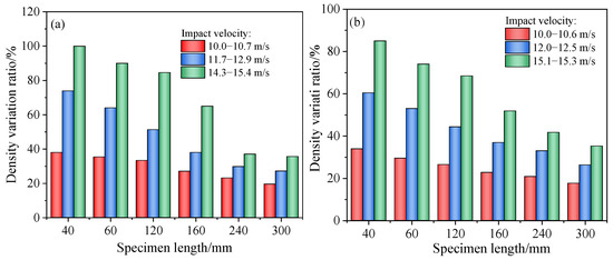The results shown in Figure 16 indicate that the density variation ratio of EPS material significantly increases with the impact velocity. At impact velocities between 14.3 and 15.4 m/s, the density variation ratio of a 40 mm short specimen exceeds 100%, suggesting substantial compression. As the specimen length increases, the density variation ratio gradually decreases, especially at 300 mm, where it drops below 30%. This reflects a decline in the impact energy absorption and transmission capabilities of longer specimens, as well as a weakening of the compaction effect. In contrast, EPE material exhibits a similar trend, but the overall density variation ratio is lower than that of EPS. For example, under impact velocities of 15.1–15.3 m/s, the density variation ratio of a 40 mm EPE specimen is about 85%, lower than the over 100% observed for EPS, thus maintaining better structural integrity. Therefore, EPE can absorb some of the impact energy and achieve partial stress release through elastic deformation, making it suitable for engineering scenarios that require high cushioning repeatability and structural integrity.