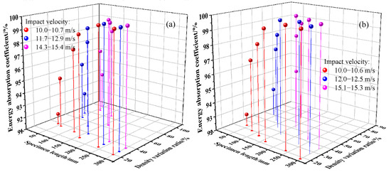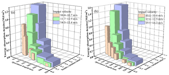 where represents the energy absorption density, WS denotes the absorbed energy, and V is the sample volume. The energy absorption density is a measure of the material’s efficiency in absorbing impact energy. The higher its value, the greater the proportion of incident energy effectively absorbed by the material, indicating better energy absorption performance.