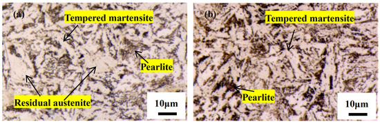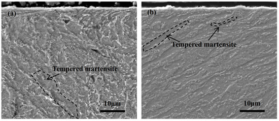 Figure 2a presents the metallographic morphology of the machining state of 30CrNi2Mo steel. The microstructure primarily consists of tempered martensite, residual austenite, and a small amount of pearlite, with little difference in surface and near surface microstructure. The tempered martensite with a width of about 7 μm was observed. However, due to the implementation of electric pulse heating, the amount of martensite and residual austenite was significantly reduced for the EUSRP sample, as shown in Figure 2b. Moreover, it was reported that strain-induced martensitic transformation after the electropulsing-assisted ultrasonic surface rolling process was found in 9310 steel, which led to the refinement of the microstructure [23].