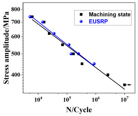 The yield strength, tensile strength, elongation, and yield to strength ratio of the machining state specimen were 730 MPa, 955 MPa, 31%, and 0.764, respectively [26]. The yield strength, tensile strength, elongation, and yield to strength ratio of the EUSRP of the 30CrNi2Mo steel specimen were 738 MPa, 946 MPa, 10%, and 0.78, respectively. Figure 4 is the curve between the rotating bending stress amplitude and the number of cycles of 30CrNi2Mo steel. It can be seen that as the stress amplitude increased, the rotating bending fatigue life significantly decreased. Only when the stress amplitude was 360 MPa could the rotating bending fatigue life of the machining state exceed 10 million cycles without fracture. However, as the stress amplitude increased, the rotating bending fatigue life of the electropulsing-assisted ultrasonic surface rolling process sample (EUSRP) was generally higher than that of the machining state specimen. The fatigue life of the machining state was 333,087, 70,000, and 24,275 cycles at stress amplitudes of 450 MPa, 550 MPa, and 620 MPa, respectively. Meanwhile, the fatigue life increased to 877,065, 117,339, and 35,516 cycles at the same stress amplitude for EUSRP samples of 450 MPa, 550 MPa, and 620 MPa, respectively, as shown in Table 1. This indicates that the rotating bending fatigue life of the EUSRP sample was higher than that of the machining state under the same stress amplitude.