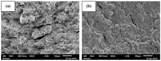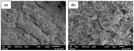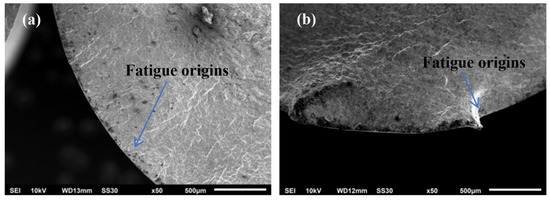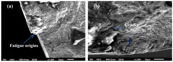 In order to further analyze the mechanism of rotating bending fatigue fracture, the initiation zone of rotating bending fatigue cracks was specifically enlarged in the specimens under different stress amplitudes to observe and analyze the detailed information. Figure 6 shows the characteristics of the rotating bending fatigue crack initiation zone of the machining state under low and high stress amplitudes. Figure 6a shows that under a stress amplitude of 550 MPa, fatigue cracks originated on the surface of the material and led to the formation of extruded bands on the surface, forming a “Z” shaped step. Under the lower stress amplitude of 450 MPa, although the fatigue cracks of the alloy still initiated on the surface of the material, it exhibited the characteristics of interconnected propagation of microcracks, as shown in Figure 6b. Fracture surfaces contained multiple cracks and crack initiation sites in the surface area, which led to the low fatigue life [24].