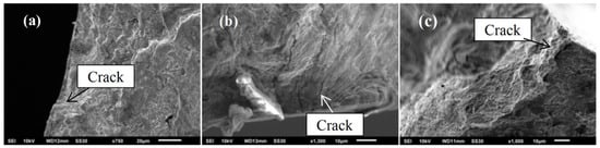 Figure 9 shows the micrograph of the fatigue crack initiation zone of the acoustic electric coupled state alloy under a stress amplitude of 550 MPa. Compared with the machining state of 30CrNi2Mo (Figure 8), the crack initiation site of the alloy after acoustic–electric coupling treatment was located near the surface. In the acoustic–electric coupling condition, fatigue cracks initiated at a depth of approximately 15 μm from the surface and tended to form at phase interfaces. These cracks subsequently interconnected and propagated within the grain boundary, as shown in Figure 9a. On the near surface, the fatigue microcracks of the alloy were relatively flat, with a combined amplitude of about 3 μm, which was an improvement compared to the machining state, as shown in Figure 9b. With the increase of cyclic deformation, in addition to observing obvious cyclic deformation, such as the twisting and rotating bending deformation of martensite, fatigue microcracks were formed during its cyclic squeezing into the extrusion band, and they were easily connected to each other (Figure 9c).