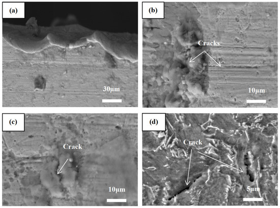 In this study, the formation of fatigue cracks was significantly influenced by the interaction between rotating bending cyclic loading and surface fine-grain structure. In order to reveal the mechanism of rotating bending fatigue crack initiation, detailed observation and analysis were conducted on the surface morphology characteristics of the fatigue crack initiation site. Figure 8 shows the rotating bending fatigue crack initiation morphology of machining state material under a stress amplitude of 550 MPa. The crack propagation path exhibited micro area twists and turns, with a microscopic rise of about 20 μm, as shown in Figure 8a. A large number of microcracks formed on the surface beneath the fatigue crack initiation zone. Once a crack nucleated, adjacent microcracks tended to coalesce, forming larger cracks. As illustrated in Figure 8b, fatigue cracks originated on the surface of the material and were relatively flat with almost no unevenness. These flat cracks were likely to accelerate the rate of crack propagation, thereby reducing fatigue life. In addition, the presence of larger grain boundaries and martensitic interfaces in the as machined microstructure also became the preferred locations for fatigue crack initiation, as shown in Figure 8c,d. These crack initiation characteristics are not conducive to improving fatigue life and have become the main reason for low fatigue life in the machining state.