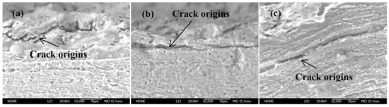 Figure 7 shows the rotating bending fatigue fracture morphology of acoustic–electric coupling state steel under different stress amplitudes. It can be seen that two larger fatigue sources were generated at 620 MPa, one larger crack source was generated at 550 MPa, and three smaller crack sources were generated at 450 MPa. Rotating bending fatigue cracks occurred on the surface and near the surface of the specimen, and then propagated into the material in a river-like pattern, forming a fan-shaped feature. Moreover, the higher the stress amplitude, the more pronounced the surface roughness, indicating that cyclic deformation and crack interaction in the alloy became more intense under elevated stress levels, resulting in more severe fatigue damage. It can be concluded that rotating bending fatigue cracks all occurred near the surface of the specimen, and then propagated into the material in a river-like pattern, forming a fan-shaped feature, as shown in Figure 7a–c. With the increasing stress, the surface roughness became more significant, leading to phenomena such as steps on the surface. Fatigue cracks originated at a position of 13 μm near the surface at a stress amplitude of 620 MPa, as shown in Figure 7a. Under the stress amplitudes of 550 MPa and 450 MPa, rotating bending fatigue cracks were primarily initiated at distances of approximately 15 μm and 22 μm from the surface of the alloy, respectively, before propagating inward, as illustrated in Figure 7b,c.